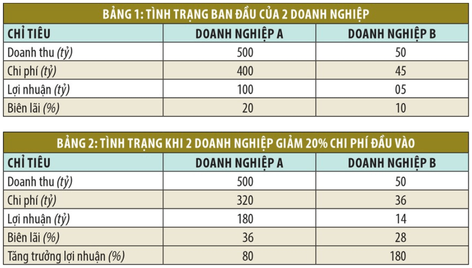 Bảng 1 là ví dụ về 2 doanh nghiệp A và B, một doanh nghiệp là đầu ngành và một doanh nghiệp nhỏ hơn doanh nghiệp kia rất nhiều. Bảng 2 cũng là 2 doanh nghiệp đó với chi phí đầu vào giảm 20% so với ban đầu. Chúng ta điều gì ở đây?