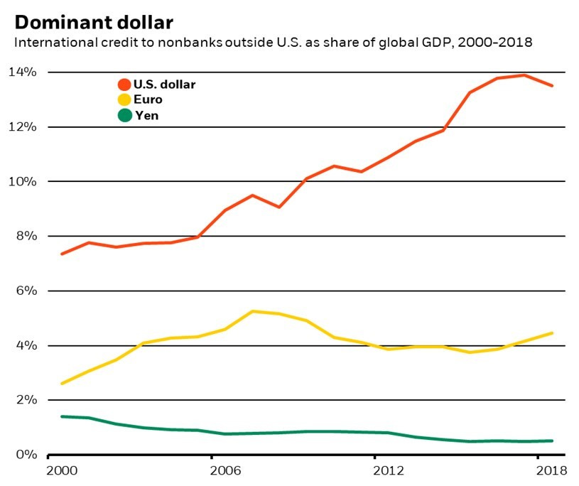 Dữ liệu thống kê chỉ ra rằng tín dụng cấp bằng đồng USD cho các tổ chức phi ngân hàng ngoài Hoa Kỳ đã tăng từ 9% GDP toàn cầu năm 2007 lên 14% vào năm 2018 và xu hướng này chưa dừng lại [HÌNH 1]. Trong khi đó tín dụng quốc tế có mệnh giá bằng Euro và Yên Nhật đang dần được thay thế bằng đồng USD.